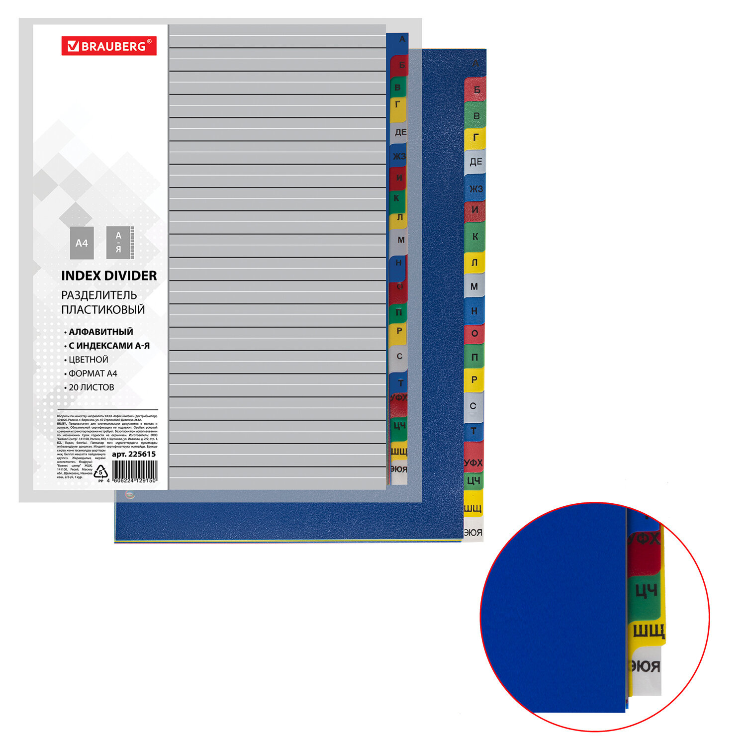 Разделитель пластиковый BRAUBERG А4, 20 листов, А-Я, цветной