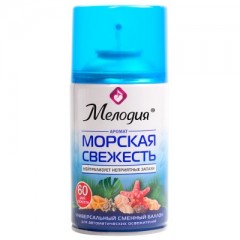 Сменный баллон МЕЛОДИЯ "Морская свежесть" быстро и эффективно устраняет неприятные запахи и освежает воздух в жилых и бытовых помещениях. Имеет приятный стойкий аромат, который надолго наполнит помещение свежестью.