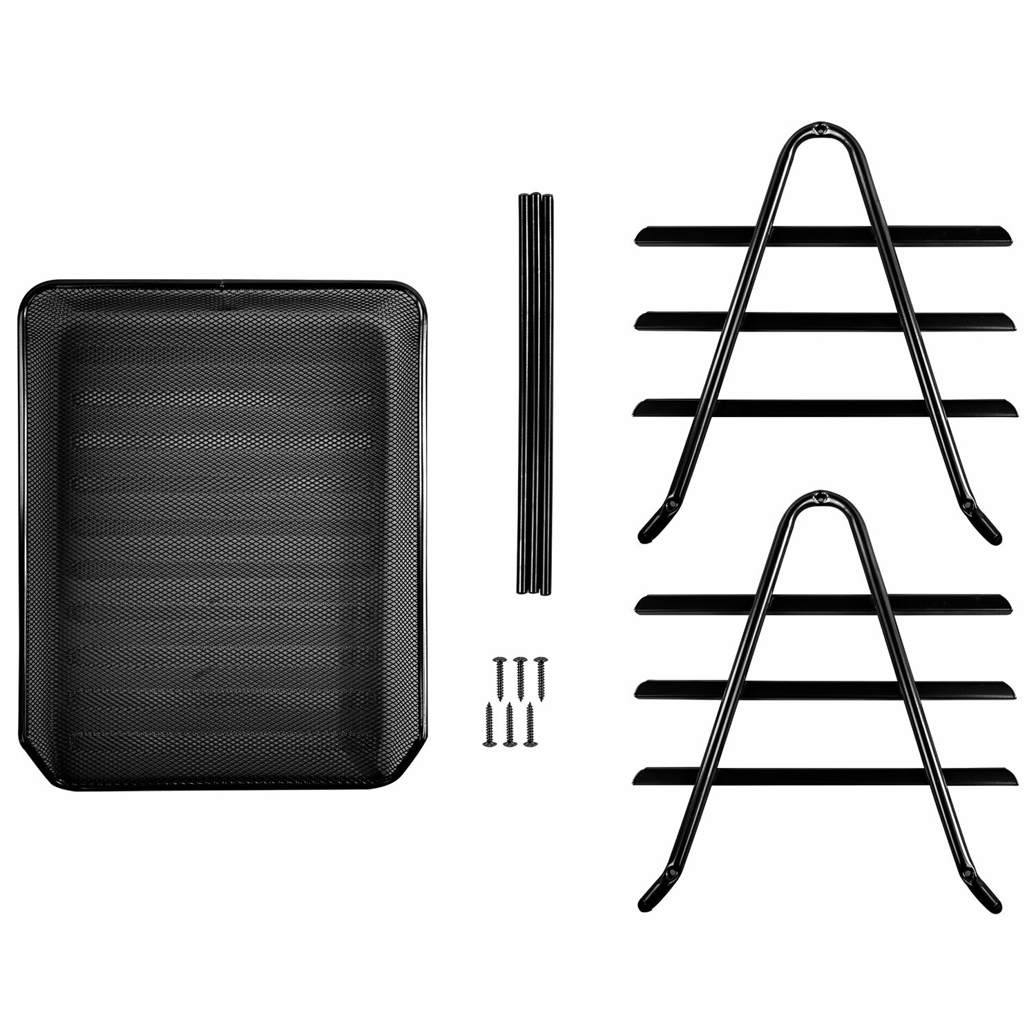 Лотки могут использоваться отдельно от опоры. Выдвижной механизм обеспечивает легкий доступ к содержимому лотков. Изготовлен из высококачественной прочной металлической сетки. Выполнен в классическом черном цвете. Размер лотка - 30х273х355 мм. Высота конструкции в собранном виде - 267 мм. Упакован в индивидуальную коробку, на которой имеется схема сборки.