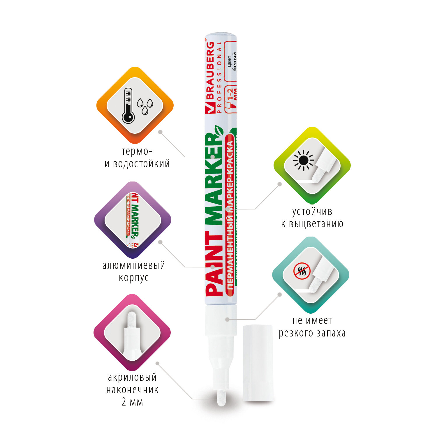 Чернила с лаковым эффектом производства компании MULTICHEM не содержат ксилол, являясь экологичными и безопасными для окружающей среды. Не имеют резкого запаха нитро-краски в отличие от большинства аналогов, что позволяет использовать данный маркер в закрытых помещениях без вреда для здоровья. Отличаются термо- и водостойкостью, устойчивы к выцветанию. Пишет по сухим, жирным, грязным, ржавым поверхностям. Ширина линии письма составляет 1-2 мм. Прочный круглый наконечник выполнен из пористого акрила. Алюминиевый корпус.