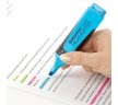 В наборе четыре неоновых цвета: желтый, зеленый, голубой и розовый. Плоская форма корпуса, диаметр которого 25 мм. Резиновые вставки обеспечивают эргономичную зону захвата, предотвращая скольжение в процессе использования. Скошенный наконечник имеет толщину линии письма от 1 до 5 мм, что обеспечивает удобство при работе с текстом, напечатанным мелким шрифтом, или таблицами. Благодаря особой водной основе чернил текстовыделители не высыхают без колпачка в течение 8 часов. Текстовыделители обладают экономным расходом чернил, при этом длина линии письма достигает 300 метров. Чернила быстро впитываются, предотвращая размазывание. Цвет корпуса соответствует цвету чернил.