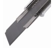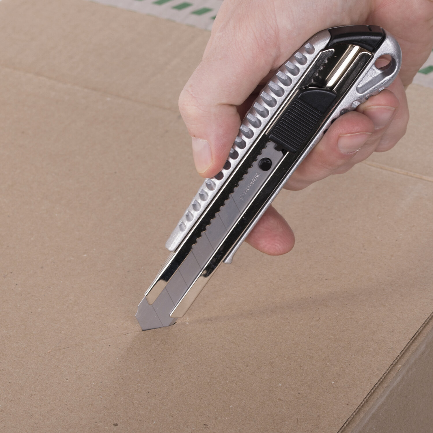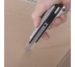 У ножа имеется надежный автоматический фиксатор длины лезвия, благодаря чему конструкция не деформируется при работе. Затупившийся конец лезвия легко удалить, отломив небольшой фрагмент. Металлический корпус серебристого цвета обеспечивает долговечность ножа, а рифленые края предотвращают соскальзывание руки при работе с инструментом. Ширина лезвия стандартная, 18 мм. Для удобства хранения имеется отверстие для подвеса. Нож продается в пластиковом блистере с европодвесом.