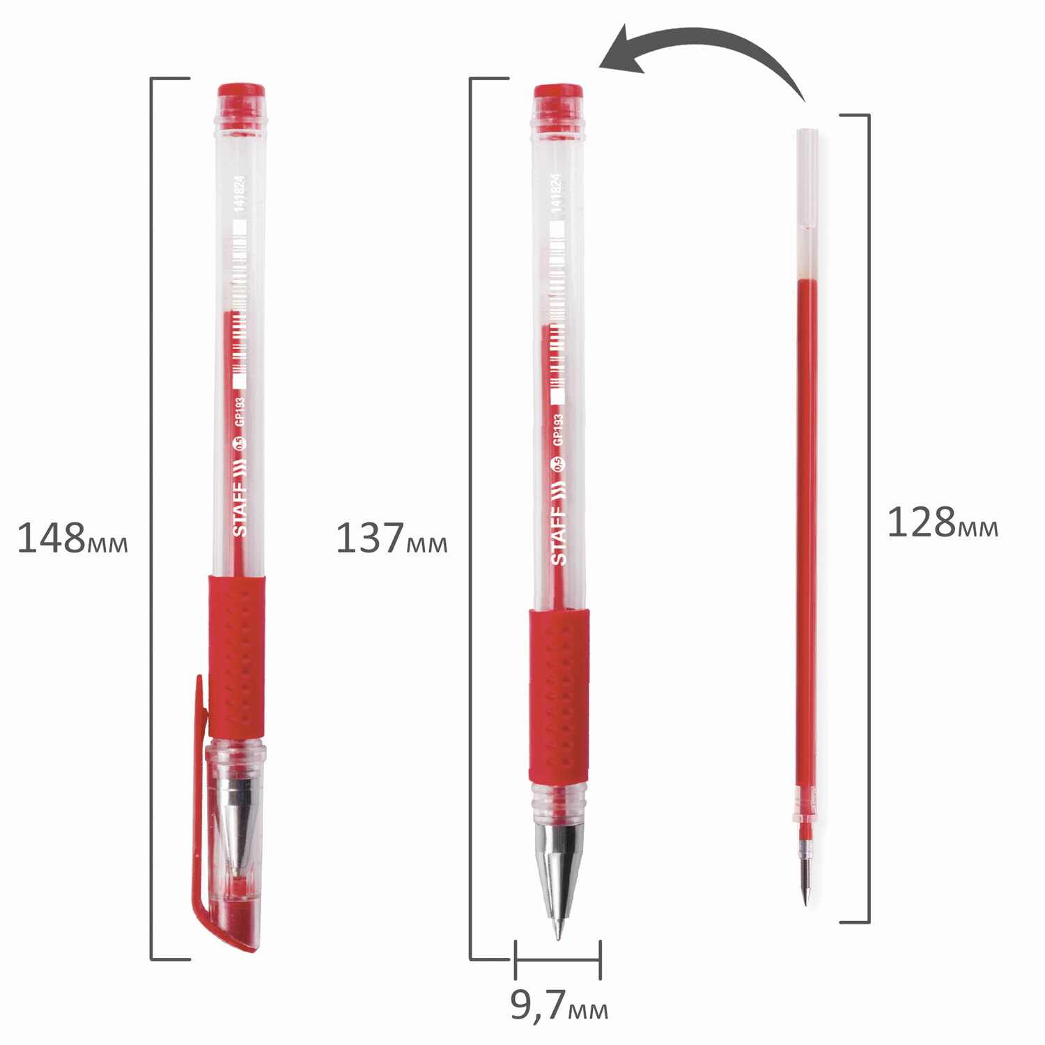 Имеет круглый прозрачный корпус с резиновым держателем. Детали ручки выполнены в цвет красных чернил. Сменный стержень длиной 128 мм со стандартным наконечником позволит использовать ручку максимально долго. Диаметр пишущего узла, равный 0,5 мм, создает линию письма, равную 0,35 мм.