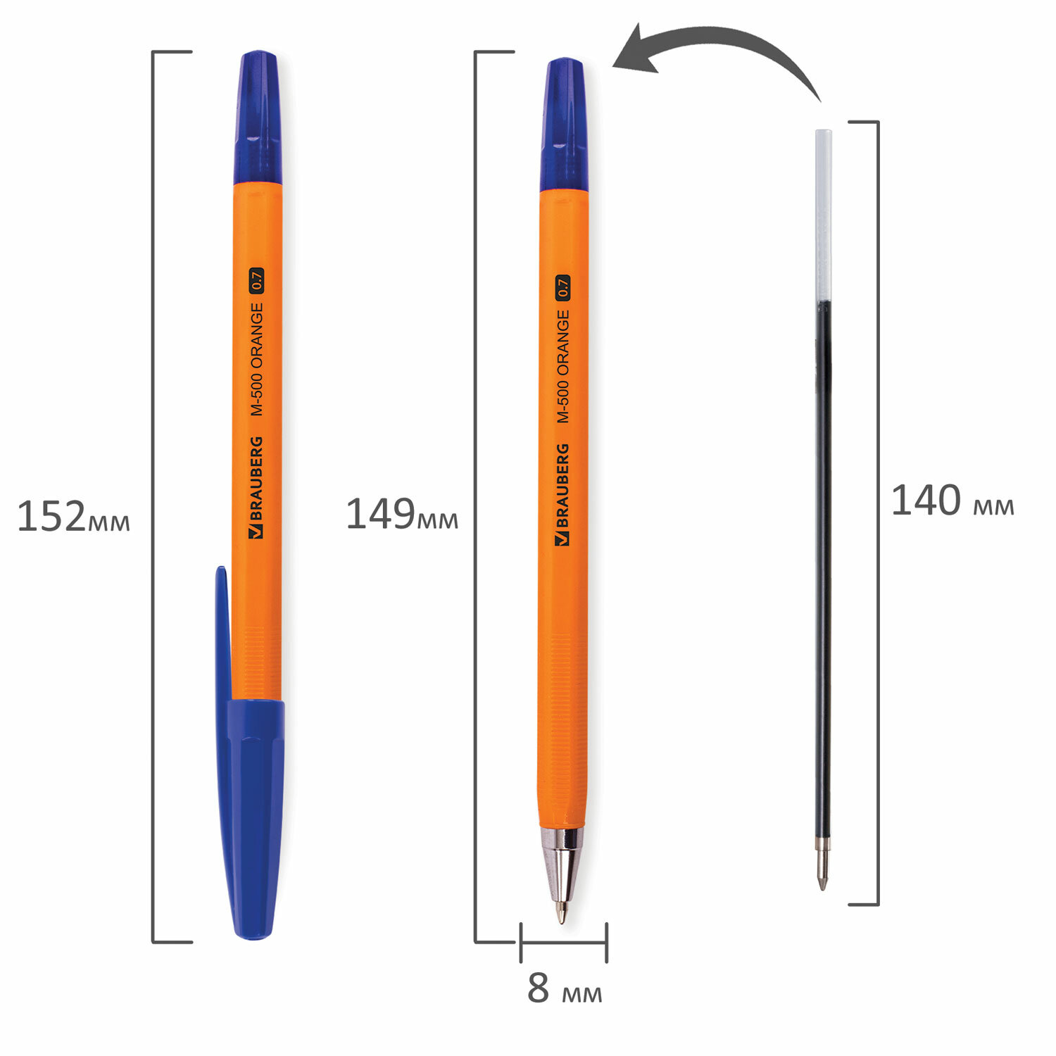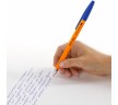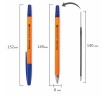 Шариковая ручка в оранжевом корпусе обладает удобной зоной захвата с рифлением, препятствующим скольжению пальцев при письме. Снабжена сменным стержнем 140 мм, что позволяет увеличить срок службы. Диаметр пишущего узла 0,7 мм создает тонкую линию письма, равную 0,35 мм. Длина линии письма составляет 2000 метров: такого расхода хватит надолго. Цвет чернил - синий.