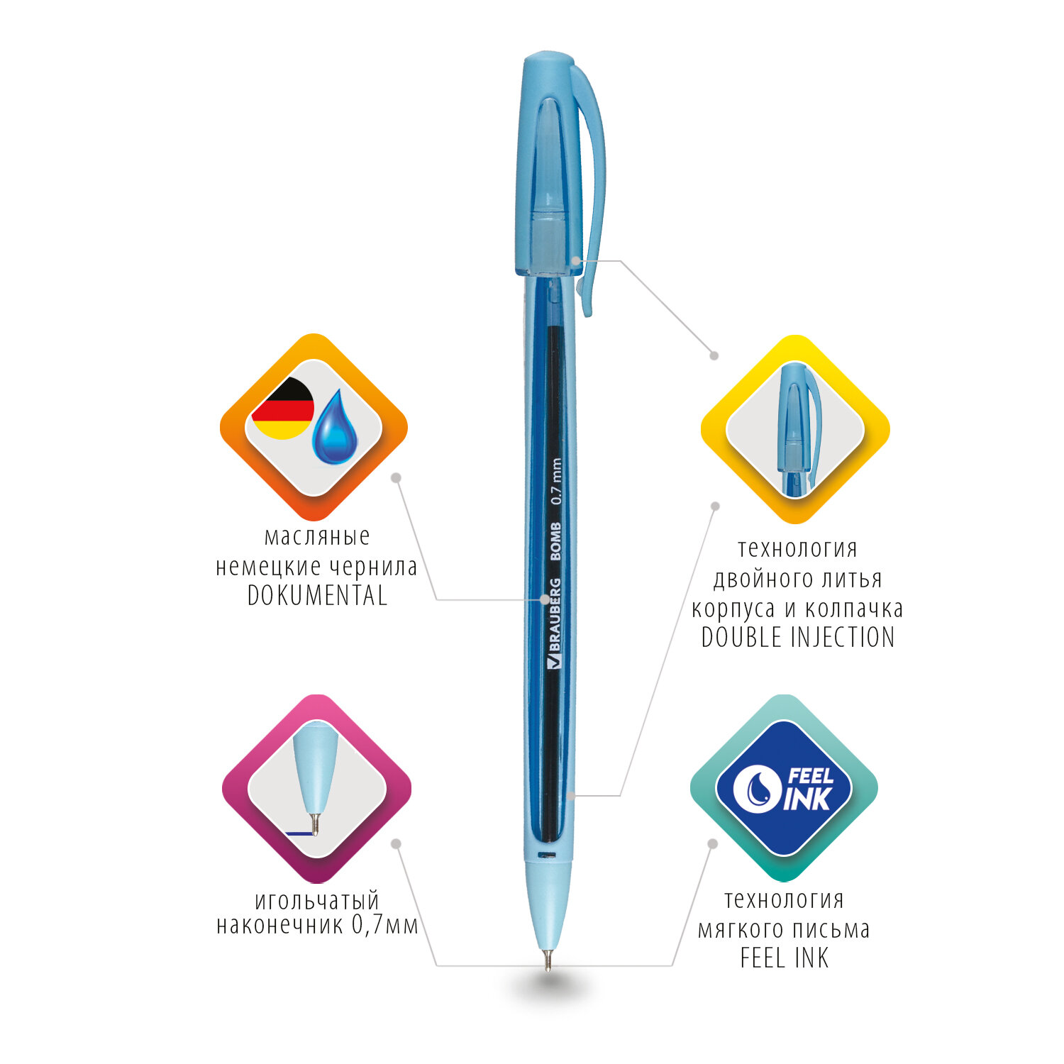 Модель изготовлена из высококачественных материалов, сменный стержень заправлен немецкими чернилами на масляной основе DOKUMENTAL синего цвета. Удобный прорезиненный корпус - double injection technology. Диаметр пишущего узла 0,7 мм создает ровную линию письма 0,35 мм. Корпус выполнен в пастельных цветах ассорти.