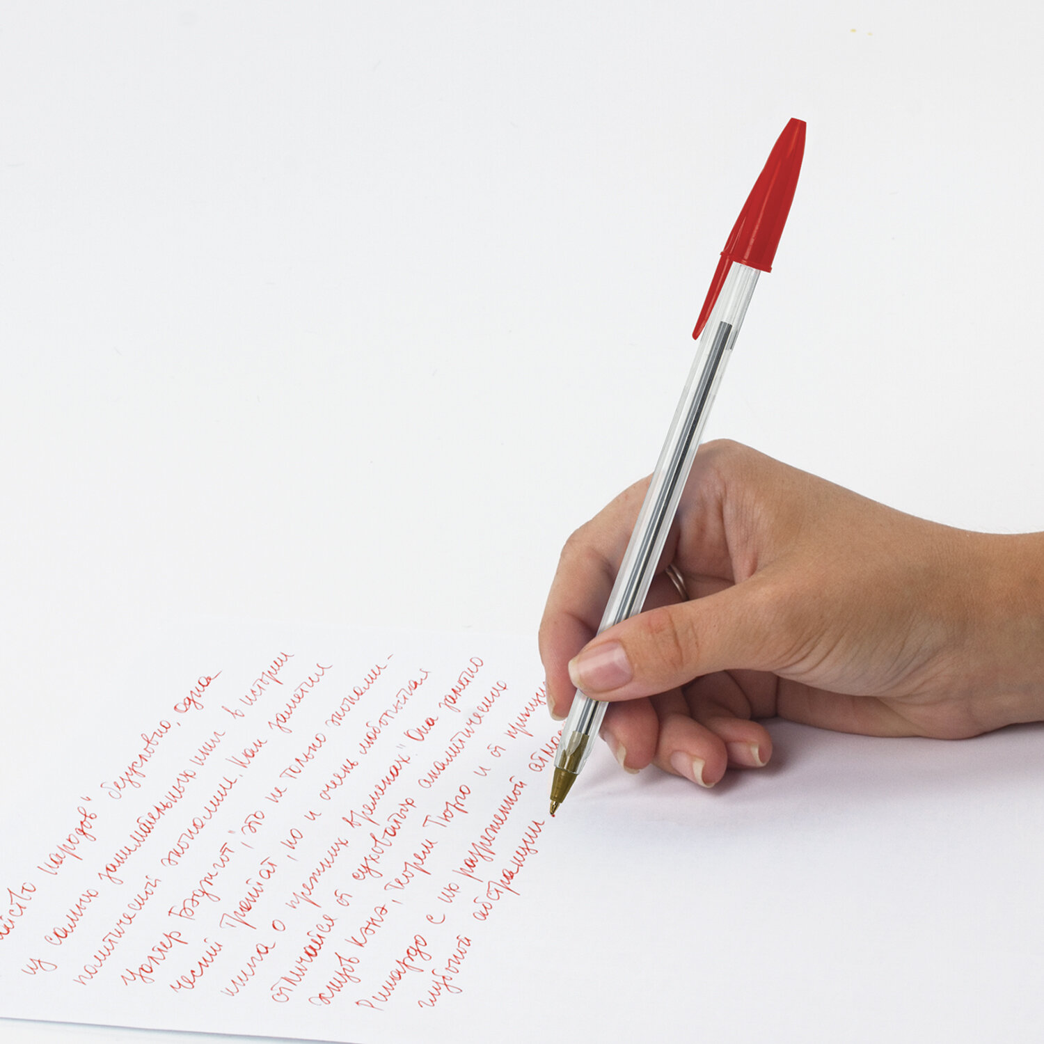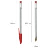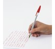 Одноразовая ручка имеет прозрачный шестигранный корпус. Детали выполнены в цвет чернил. Длина корпуса 13,5 см. Диаметр пишущего узла 1 мм создает ровную линию письма, равную 0,5 мм. Цвет чернил - красный.