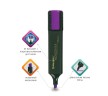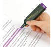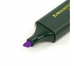 Текстовыделитель фиолетового цвета имеет плоскую форму корпуса, диаметр которого 25 мм. Скошенный наконечник имеет толщину линии письма от 1 до 5 мм, что обеспечивает удобство при работе с текстом, напечатанным мелким шрифтом, или таблицами. Благодаря особой водной основе чернил текстовыделитель не высыхает без колпачка в течение 8 часов. Текстовыделитель обладает экономным расходом чернил, при этом длина линии письма достигает 300 метров. Чернила быстро впитываются и тем самым предотвращают размазывание в процессе использования. Светоустойчивые чернила не выцветают даже на открытом солнце. Цвет клипа текстовыделителя соответствует цвету чернил.