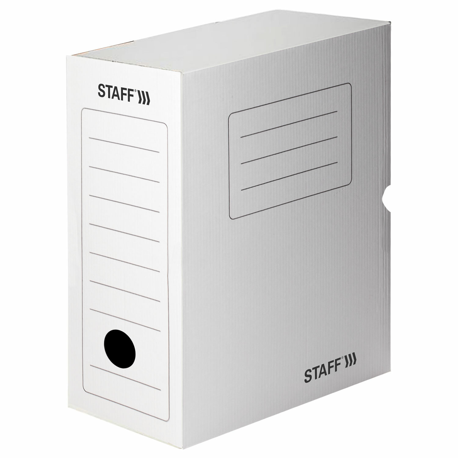 На корешке и боковой стенке есть место для описания содержимого коробки. Отверстие для пальца помогает ставить и доставать коробку с полки. |