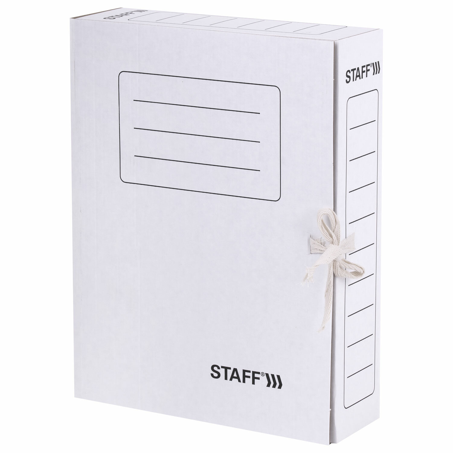 На корешке и боковой стенке есть место для описания содержимого коробки. Отверстие для пальца помогает ставить и доставать коробку с полки. |
