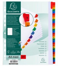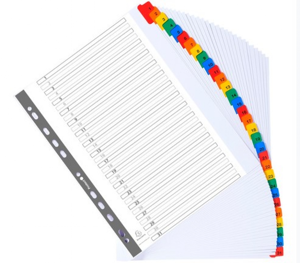 Разделитель на 31 деление Exacompta выполнены из плотного картона плотностью 160 г/м2 и цветного пластика. Универсальная перфорация позволит использовать их в любом виде папок. Формат А4 Maxi (24,5x29,7 cm) отлично подойдет как для использования с обычной перфорированной бумагой, так и с документами в файлах.
