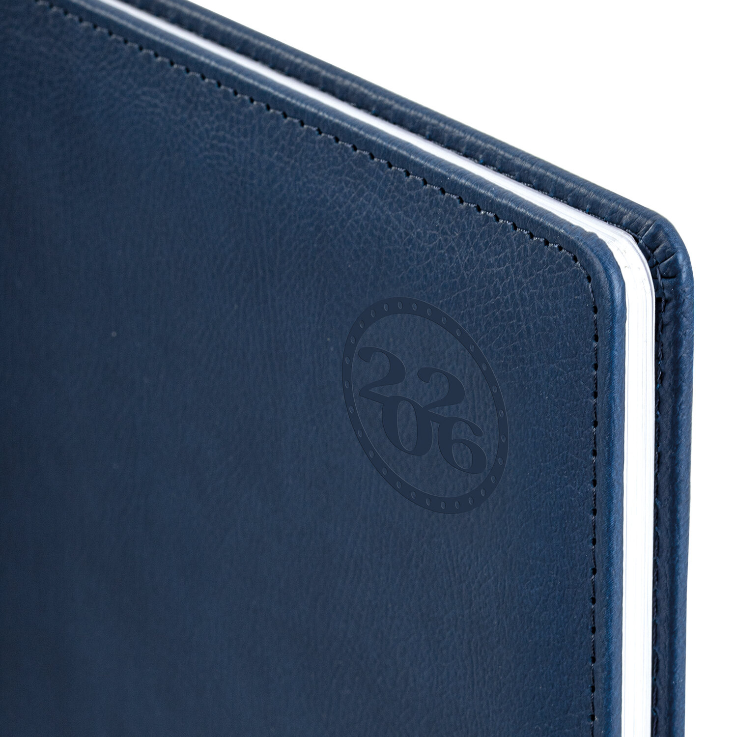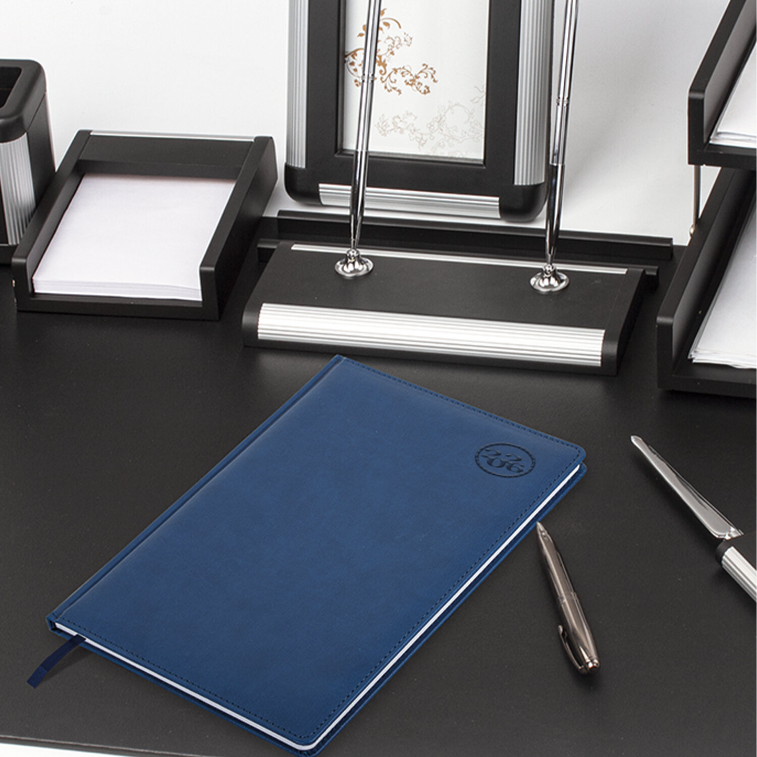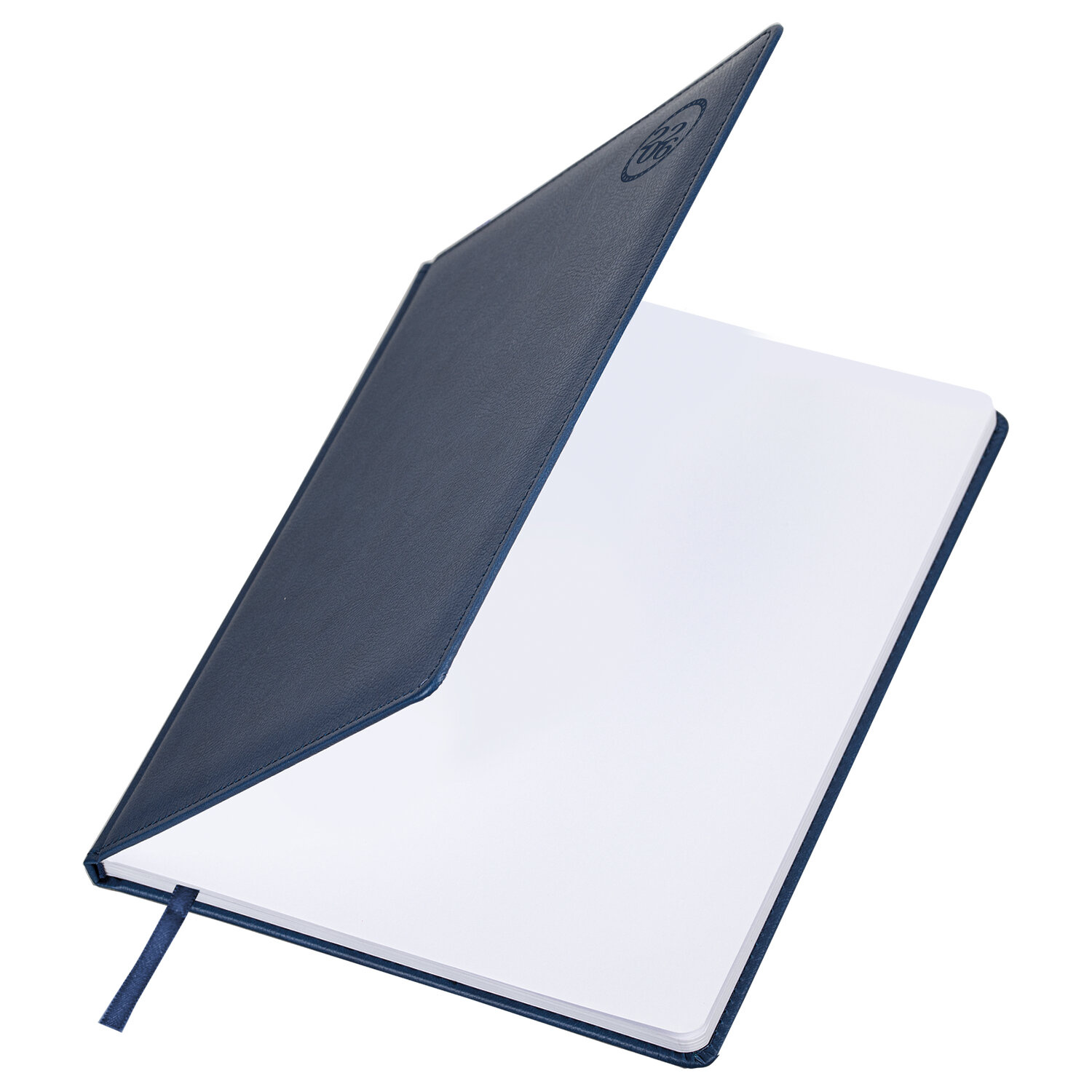 Внутренний блок включает 64 листа белой бумаги плотностью 70 г/м2. Благодаря большому формату А4 (210х297 мм) еженедельник удобно использовать как в офисе, так и на выездных деловых встречах. Твердая обложка синего цвета, стилизованная под фактурную кожу, подходит для горячего тиснения.